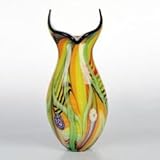 Hand-blown glass vase with colorful abstract designs of swirls and patches in warm tones of yellow and orange.